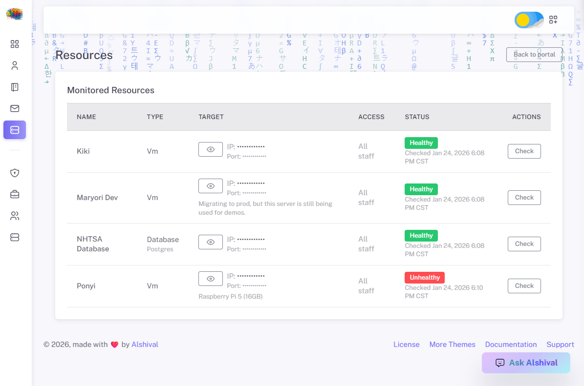 But here's why I love the Resource Manager. We built tools to monitor the health status of virtual machines, databases, API endpoints, etc., that we maintain for our clients. Alshival checks the health of our resources periodically. In the screenshot below, we see the different resources being monitored by Alshival.