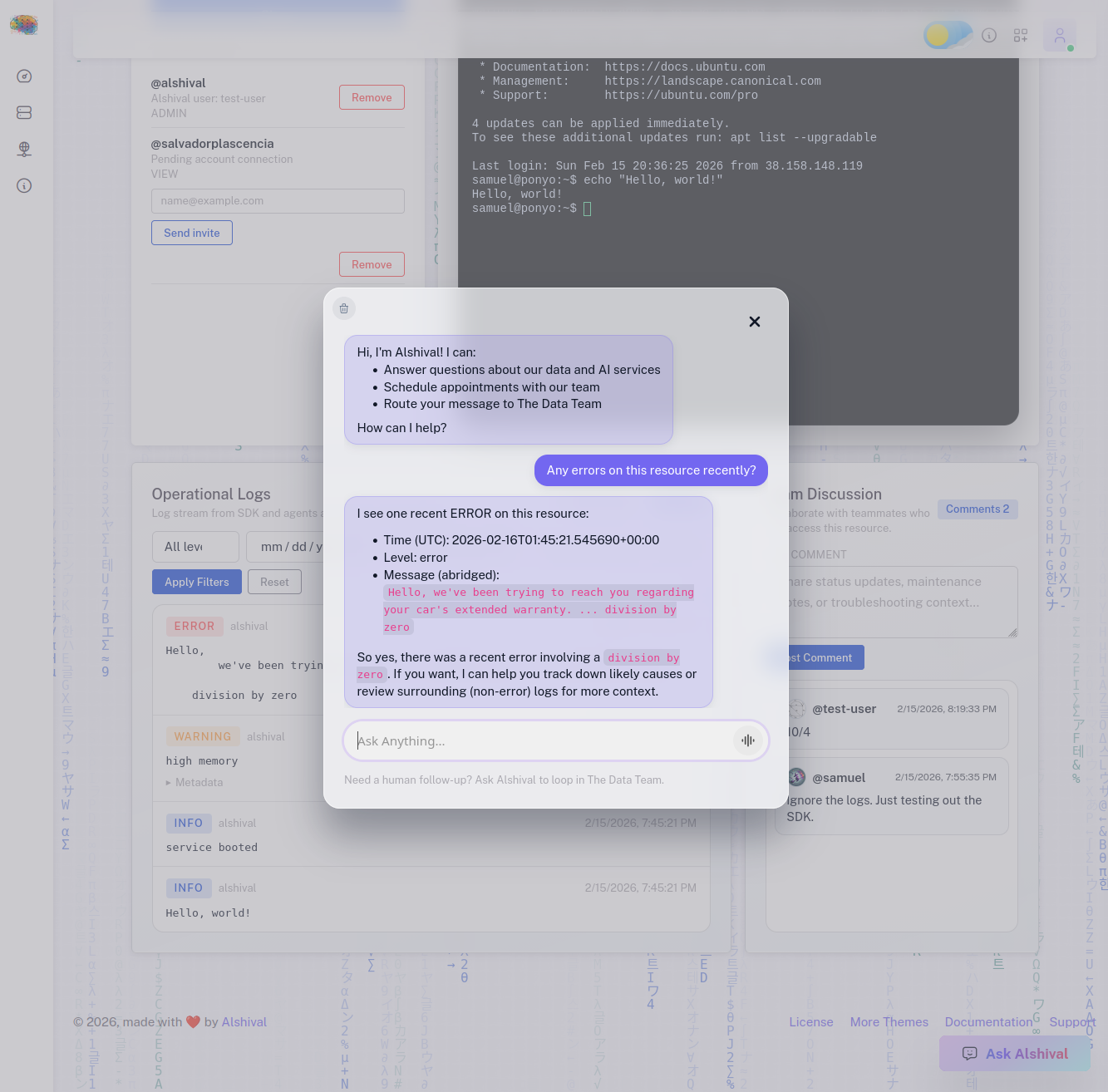 You can work with Alshival through the web app, SMS, and team channels like Discord and Slack. The goal is simple: reduce context switching and make operational response faster.