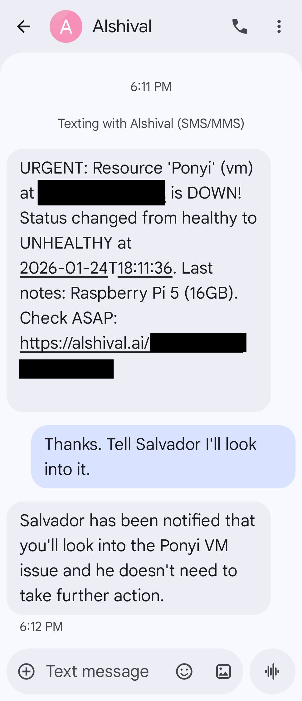 The health changes. The issue is that nobody wants to monitor these resources 24/7. But Alshival doesn't mind. Within a few minutes, Alshival notices the resource is down and notifies the team with an SMS. Just one of the many things that Alshival does at [Alshival.Ai](https://Alshival.Ai).